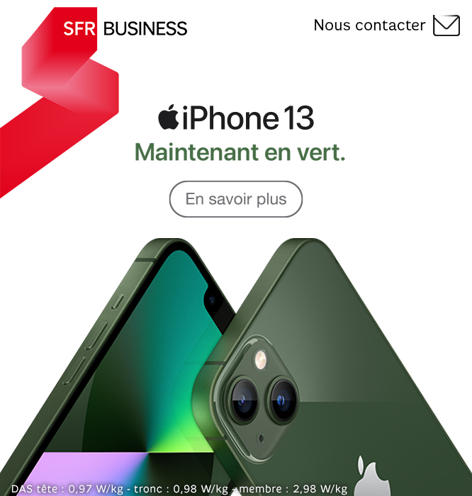 | Offre accessible uniquement en France Métropolitaine, sur un contrat de téléphonie mobile SFR Business et disposant des Conditions Tarifaires Standards. Livraison gratuite en France métropoliaine. Réseau 5G, en cours de déploiement, valable sous réserve de couverture avec offre et terminal 5G compatibles. Réseau 5G 3,5 Ghz ou 2100 MHZ disponible selon les communes des agglomérations couvertes. Détails de couverture sur https://assistance.sfr.fr/mobile-et-tablette/reseau-sfr/couverture-reseau-sfr.html. La 5G présentant des performances différentes suivant les fréquences utilisées, débit descendant maximum théorique (association des fréquences 4G et 5G dans les zones couvertes) de 2 Gb/s en bande de fréquence 3,5Ghz et de 995 Mb/s en bande de fréquence 2100 Mhz. Le DAS (Débit d´Absorption Spécifique) des téléphones mobiles quantifie le niveau d´exposition maximal de l´utilisateur aux ondes électromagnétiques, pour une utilisation à l´oreille. La réglementation française impose que le DAS ne dépasse pas 2 W/kg pour le tronc et la tête et 4 W/kg pour les membres. Vous êtes informé(e) que les Données à caractère personnel (notamment les données d’usage) que vous communiquez sont destinées à SFR Business, en tant que Responsable du Traitement, pour la gestion d'une base de contacts et la mise en œuvre d'opérations de prospection commerciale. Vous disposez d'un droit d'accès, de rectification, de modification et de suppression sur vos données. Pour en savoir plus sur la gestion de vos données et vos droits cliquez-ici |